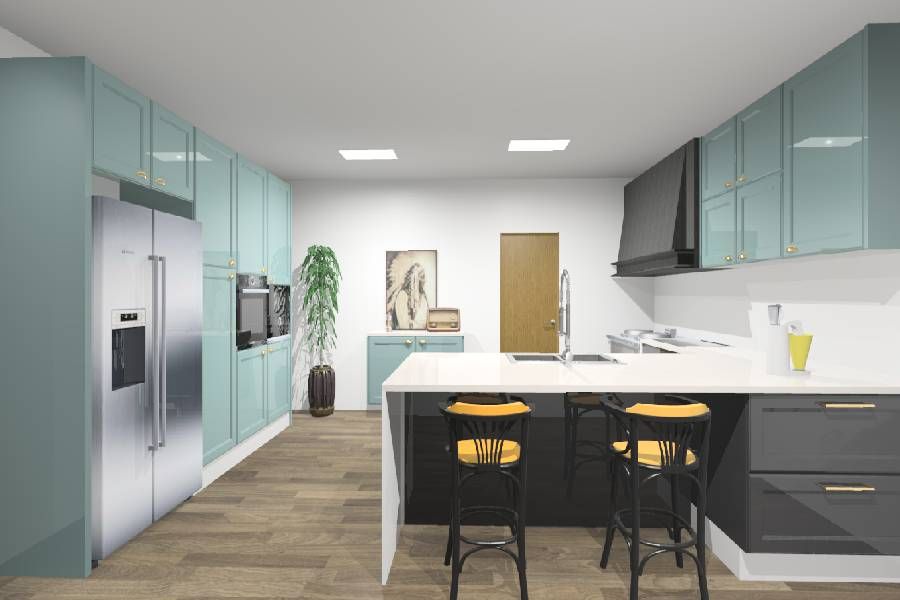 Cozinha Lacada com Modelo de Porta Canarias na cor Agua Marina e Antracite com Puxador Asa/Cilindrico na cor ouro e Tampos em Dekton Zenith