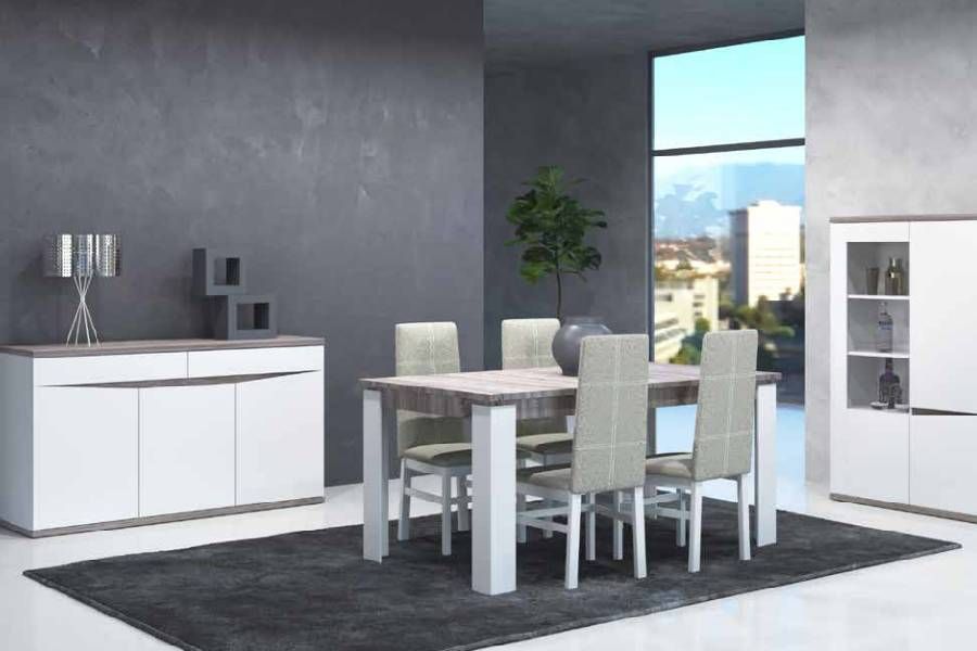 Categoria: Salas de JantarReferência : FlyDescrição : Sala Jantar Fly Melamina Carvalho/branco Aparador-870x1550x450 Mesa 1400/2300x900x750